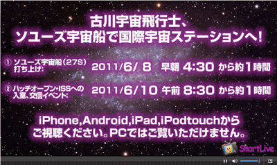 第3弾の宇宙開発プロジェクトLIVE中継として、去る2011年1月22日(土)の宇宙ステーション補給機「こうのとり2号機」/H-IIBロケット2号機打ち上げ、国際宇宙ステーション(ISS)への接近~ロボットアームによる把持、そしてISSへの結合および大気圏再突入の模様を、独立行政法人宇宙航空研究開発機構(JAXA)映像協力のもと、「SmartLive」にて iPhone および iPad 、 iPodtouch 、さらにAndroid端末にマルチデバイス向け同時ライブ中継いたしました。 今回、6月8日(水)早朝に予定されているソユーズ宇宙船(27S)打ち上げと、10日(金)午前に予定されている国際宇宙ステーション(ISS)へドッキング後、ハッチを開けて古川宇宙飛行士らソユーズ宇宙船(27S)搭乗クルーがISSへ入室する様子、入室後の交信イベントの模様をライブ中継いたしますのでお知らせいたします。 なお今回はPC向けのライブ中継は行いません。