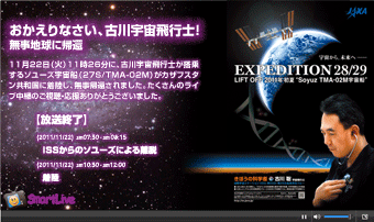 【放送終了】 先日ご案内いたしました、スマートフォン(iPhone, Android)&タブレット(iPad), iPodtouch等に向けての古川宇宙飛行士帰還生中継は無事終了いたしました。沢山の方々にご視聴いただきました。誠にありがとうございました。 【SmartLive】 帰還ライブ実施! 古川宇宙飛行士、お疲れさまでした!ライブ中継で見守りながら、み …