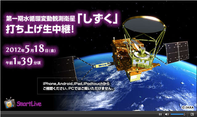 Apple, Flash Media Server, FMS, iOS (iPhone_iPad_iPodtouch), SmartLive(ライブ配信)Android, H-IIAロケット, iPad, iPhone, JAXA, SmartLive, しずく, スマートフォン, タブレット, ライブ中継, ライブ配信, 種子島宇宙センター, 第一期水循環変動観測衛星