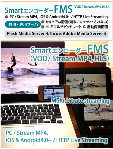 • HTTP LIVE STREAMING(HLSプロトコル/セキュア配信)またはPCへStream MP4(AMS or FMSセキュア配信)