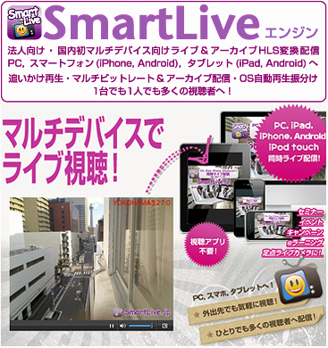 1997年ナローバンド時代よりメディア潮流に先駆け、PCはもちろんのことフューチャーフォン、スマートフォン&タブレット等マルチデバイス向けライブストリーミング&VODストリーミングのASP及びご希望の仕様に基づいたプラットフォーム開発・インフラ(変換エンジン・配信システム、サーバホスティング、バックボーン)も含めリッチメディアによる配信をトータルにサポートしております。